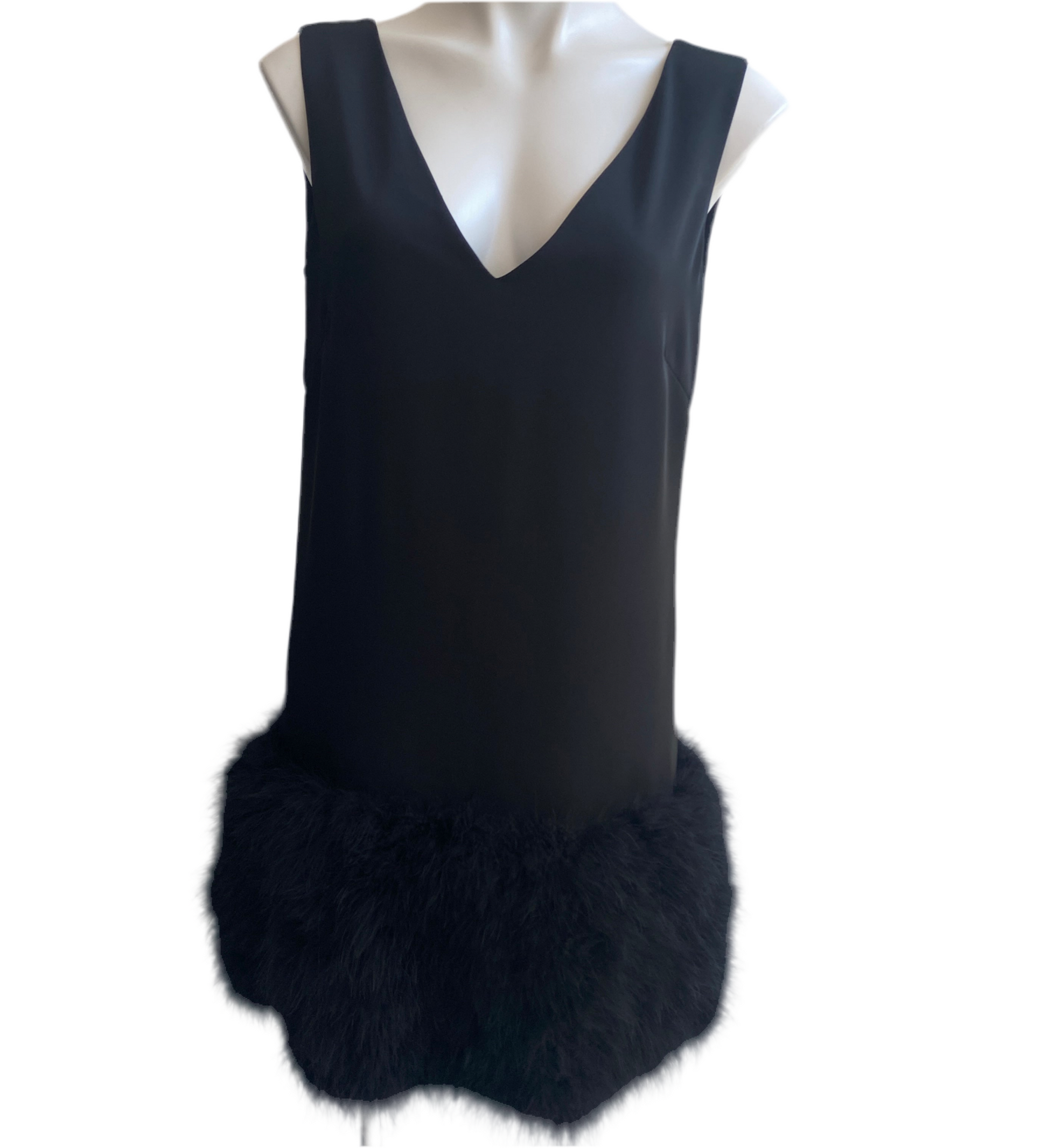 BCBGMAXAZARIA v-neck black short party dress with feather trim, lined. 100% polyester shell and lining. 100% turkey feather trim.