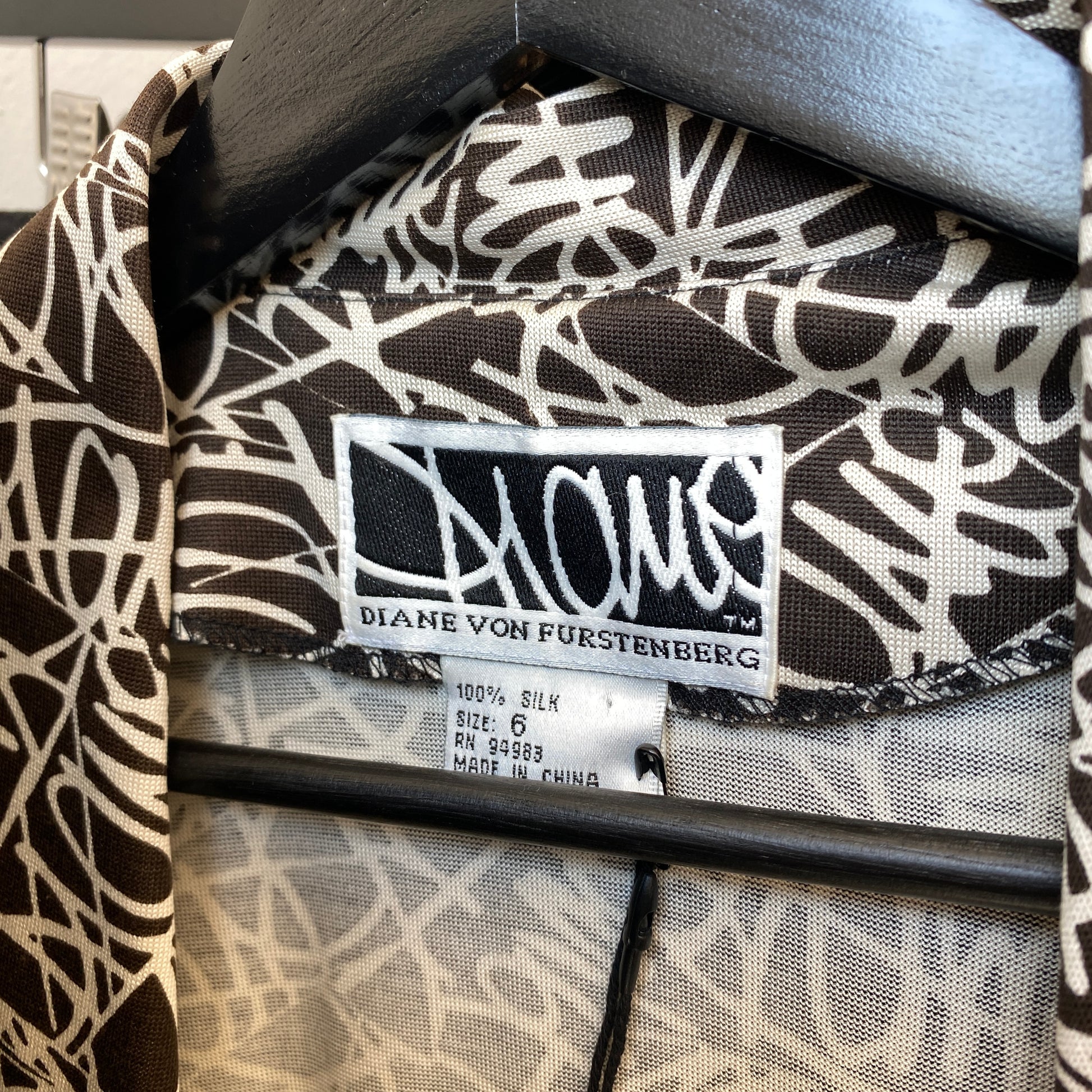 Diane by Diane Von Furstenberg long sleeve brown and white logo midi wrap dress, 100% silk.